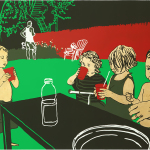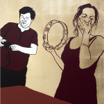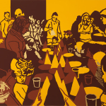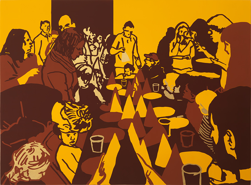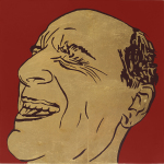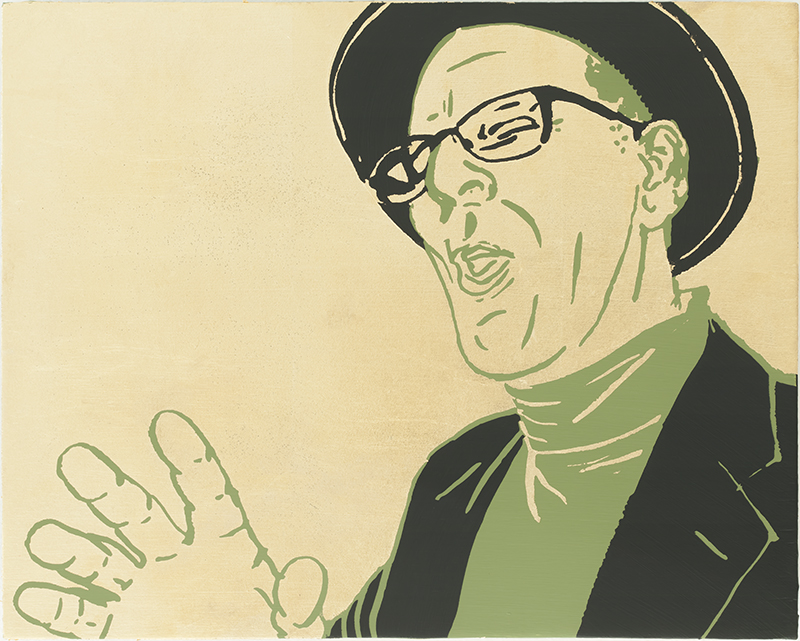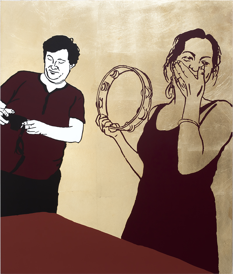 The spray paint & gold leaf drawings are executed using computer-cut stencils that precisely mimic quick, loose, and unrefined ink drawings. The medium, typically used by the signmaking industry, offers the ability to render work that appears hand-drawn yet looks machine-made. Each image begins with a series of “takes” of the original brush and ink drawing, which are then digitally spliced together. The resulting drawings use an economy of linework that portrays the subjects with vitality and veracity. The colors, stemming from a limited yet audacious color palette, paired with the gold leaf, serve to elevate and illuminate these moments.