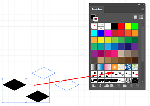 – Instead of a solid fill for the diamonds, use the black to white gradient. Apply it either as a radial or linear gradient. Drag the two shapes to the swatches pattern.