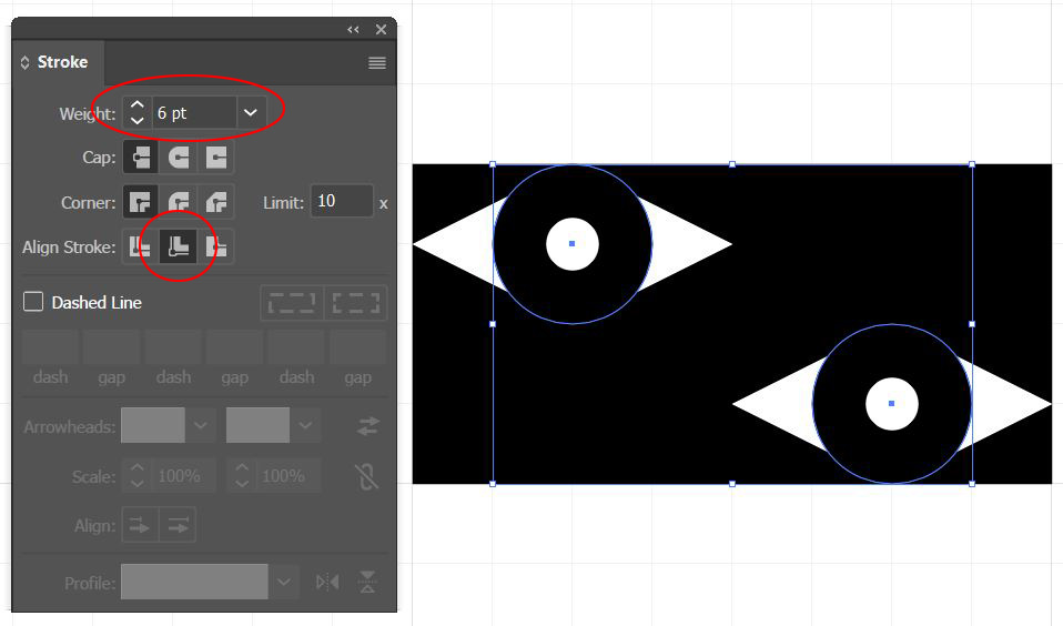 – With the pattern reversed make the diamonds into eyes. Type D on the keyboard then choose the Ellipse Tool, hold down the ALT/OPT key and draw a circle from the center of each diamond. Change the stroke weight of each to 6 pts and align the stroke the inside.