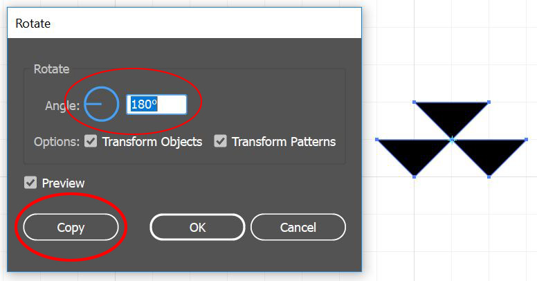 5. Select all three triangles and double-click the Rotate Transformation tool on your toolbar, type in 180 degrees and click Copy.