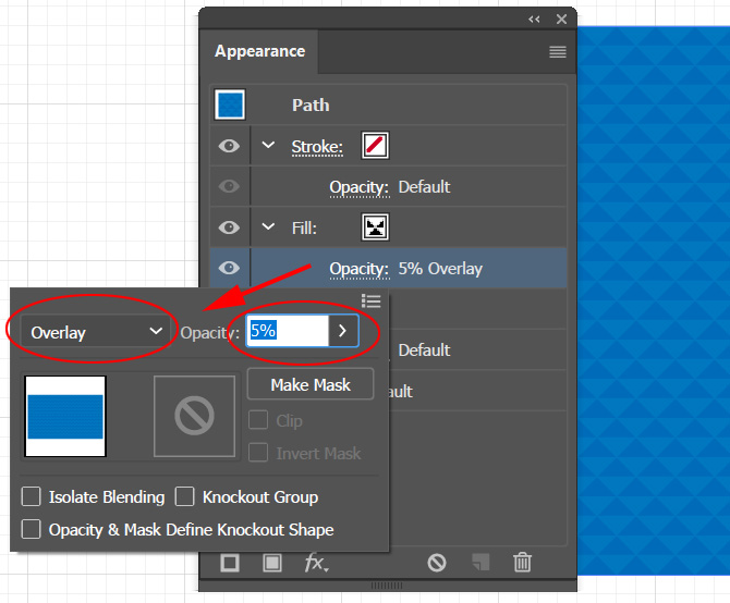 Bear in mind the order the fills are stacked is the order they appear in the object – the topmost fill will affect the bottom fills. Change the bottom fill to a solid color and then change the opacity of the top fill (triangles) to Overlay and an opacity of 5%. You will now see the triangles take on the color of the background.