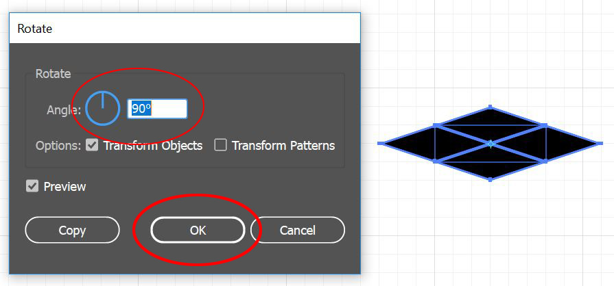 3. With the pattern selected, double-click the Rotate Transformation Tool and rotate the swatch 90 degrees, click OK.