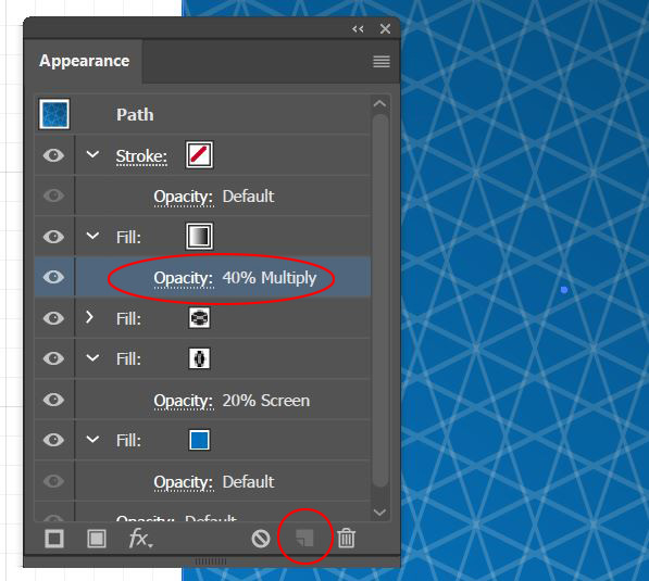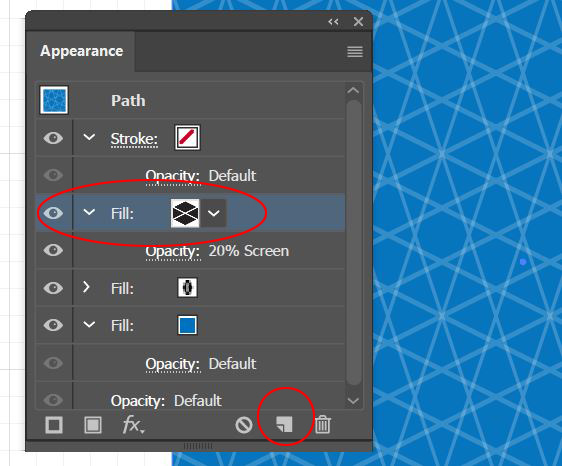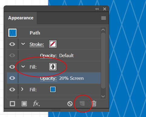 6. In the Appearances Panel add a new fill and choose the vertical diamonds as the fill, change the Opacity to Screen at 20% – this will make the black of the pattern disappear and the white will modify the base color by making it lighter (if you want to make the base color darker and maintain the same base color for the lines choose Multiply as your blending mode.)