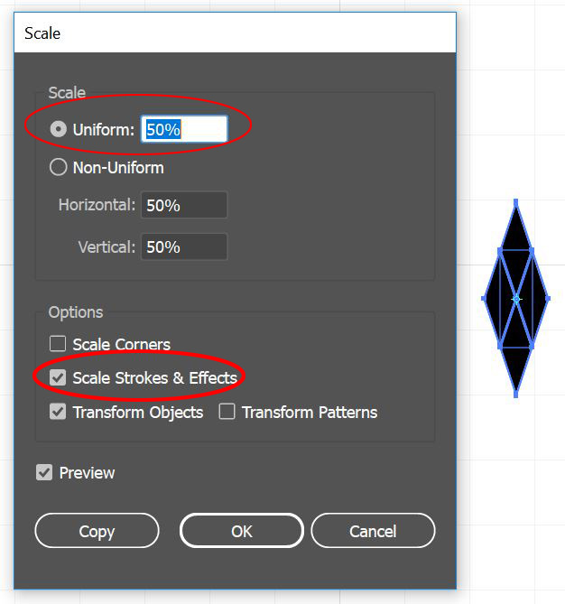 – Instead of changing the rotation of your second Swatch, change the scale to 50% and make a new swatch (when scaling make sure that Scale Strokes and Effects is checked in the Scale Rotation Tool.)