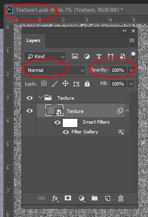 12. If you want to edit the filters after the fact, double-click on the Smart Object in the Layers Panel and Photoshop will open the Smart Object as a separate Photoshop File with the name of the Layer + .psb at the end. You can edit this file to change filters, add layers, adjust blending modes etc. Once you save it, it will automatically update the original file. For this tutorial I want to be able to control the blending mode in the original file instead of the smart object. Double click the Smart Object Texture and in the Texture.psb window, open up the group layer and change the blending mode for Texture to Normal at 100%. Save the file and close it.