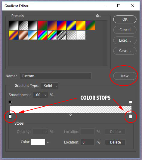 In the Options bar click on the Gradient Thumbnail, then in the Gradient Editor select the black to transparent gradient (typically the second one in from the top) you will know it goes to transparent because it shows the gray and white checkerboard, click on the color stop on the left-hand bottom side and change the color to white, do the same for the right-hand side. Click on New to save the gradient to your gradient palette then click OK.