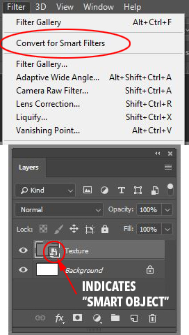 3. Go to the FILTER menu > CONVERT FOR SMART FILTERS. What this does is makes the layer you just created into a Smart Object. Because it’s a Smart Object, you can perform all sorts of filters and effects without destroying the original AND you can adjust the filters and effects after they’ve been applied.