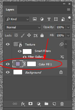 8. Change the Blend Mode for the Texture Layer to Soft Light with an opacity of 33%. Soft Light will lighten or darken the image based on the tonal values in the blend layer (Texture.) With Soft Light, blacks or whites will never make the base layer (Color FIll 1) pure black or white.