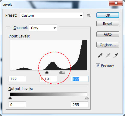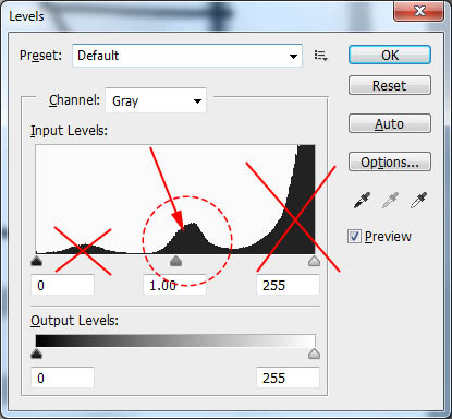 6. In this particular adjustment, black and white were clipped right to the beginning and end of the “mountain” in the middle and the gray point (gamma) was moved all the way over towards white to eliminate even more of the gray cast.