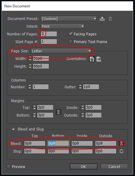 1. Create a new document in InDesign with 3 facing pages letter size (8.5 x 11) and op9 (1/8″) bleed