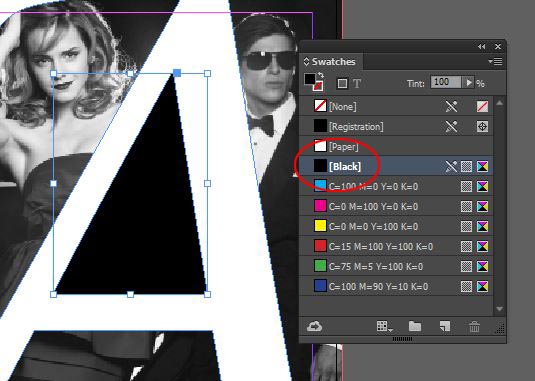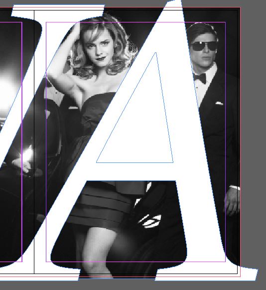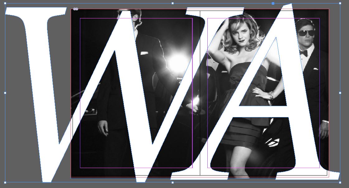 5. Zoom out so you can see the page 2 and 3 spead in your window. Take the WA letterforms, drag them over the the spread and scale them up using the SHIFT key so that they fill the entirety of the spread (including bleeds) and more. The goal is to reveal Emma Watson’s face between the W and the A and to have the letterforms completely bleed off the document.