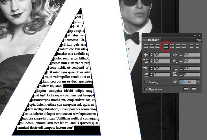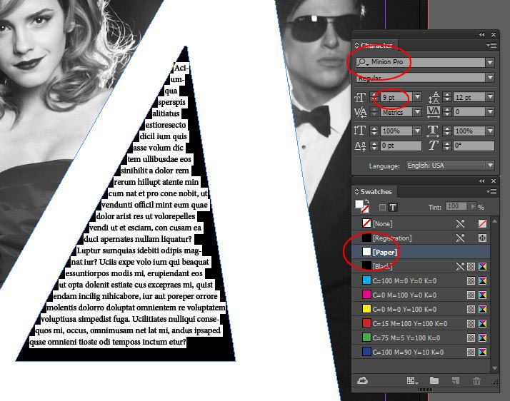 11. Change the type to Minion Pro Regular 9pts with 12 pt leading, change the fill color to white and go to the TYPE menu > FILL WITH PLACEHOLDER TEXT