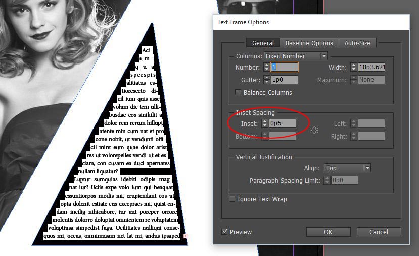 12. To give the type some space away from the edge of the frame select the text frame and go to the OBJECT menu > TEXT FRAME OPTIONS and change the Inset Spacing to 0p6 (6 pts)