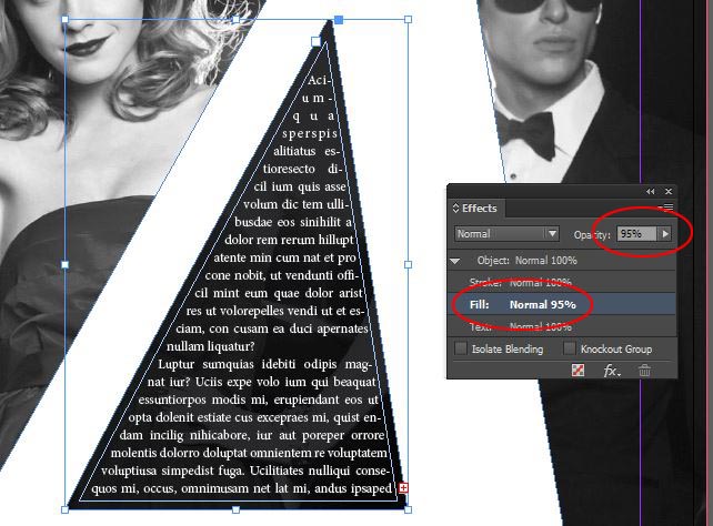 13. Select the text frame and open the Effect Panel – WINDOW menu > EFFECTS. Select Fill in the list of attributes for the object selected and change it to 95% – this will allow you make the fill partially transparent but leave the type at full opacity.