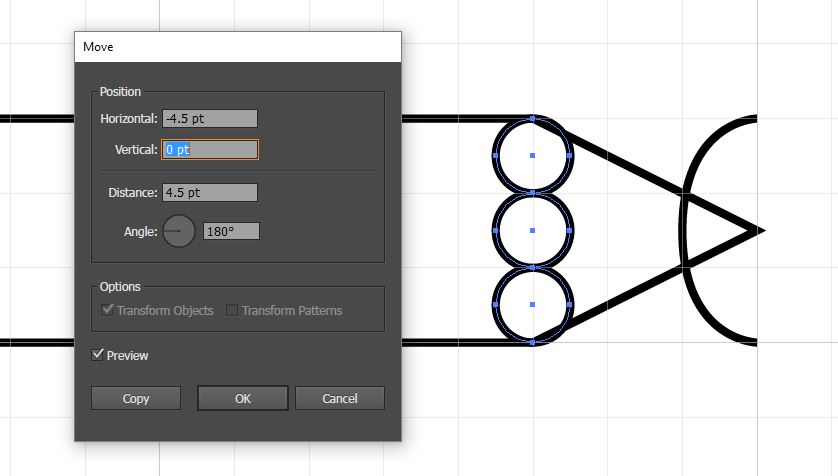 14. Select the three circles and double click the black arrow put -4.5pt for Horizontal and 0 pt for vertical. Click OK
