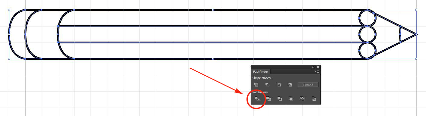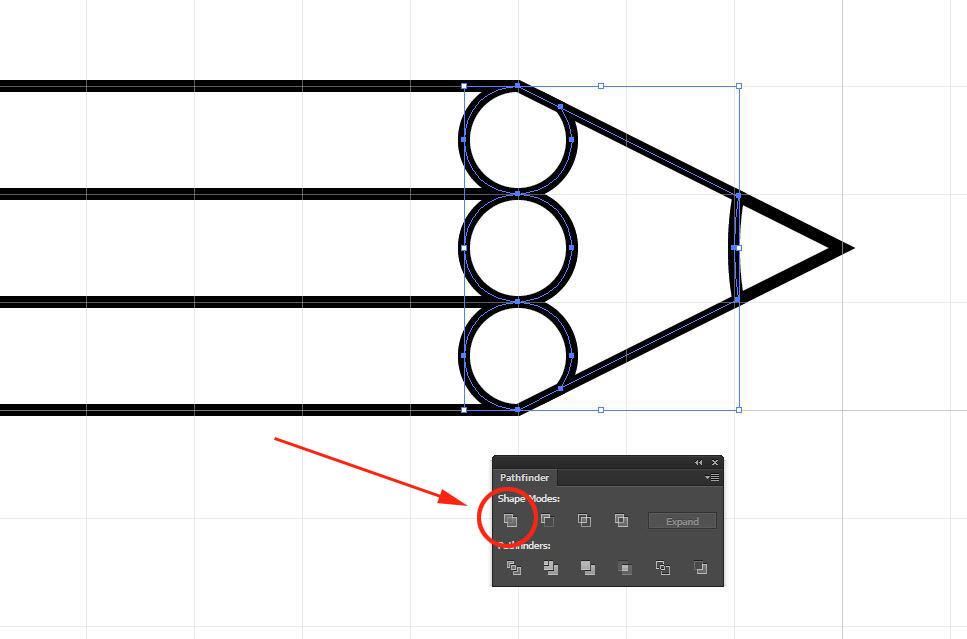19. Select the three circles and the shape to their right (hold down the shift key to add or subtract from your selection) and click on the UNITE icon in the pathfinder panel to merge all the shapes.