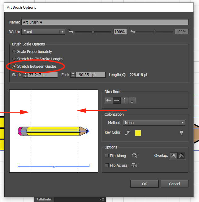 22. Change the brush scaling option to Stretch Between Guides and align the guides with just the pencil body (yellow part) of the pencil so that only that part will stretch.