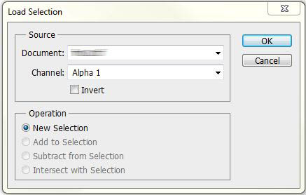 8. Select the CMYK channel as the current editing space (CMYK will be highlighted in blue in the channels palette.) Load the alpha channel as a selection – go to the SELECT menu > LOAD SELECTION and select Alpha 1.