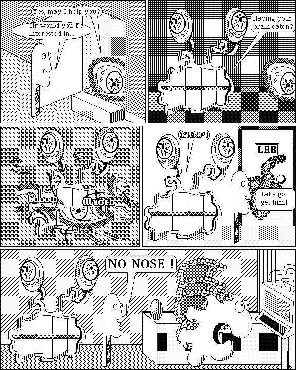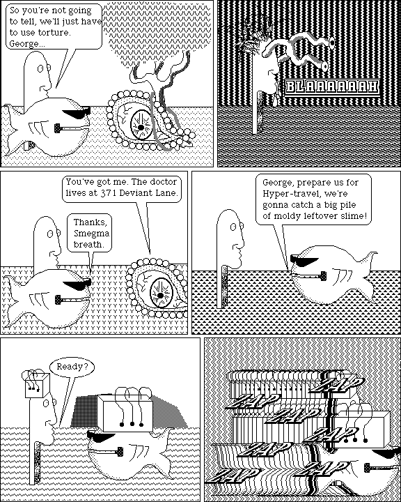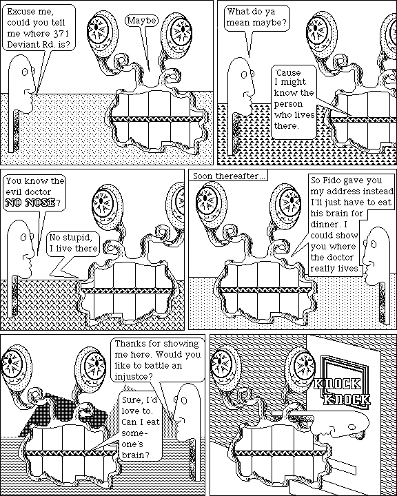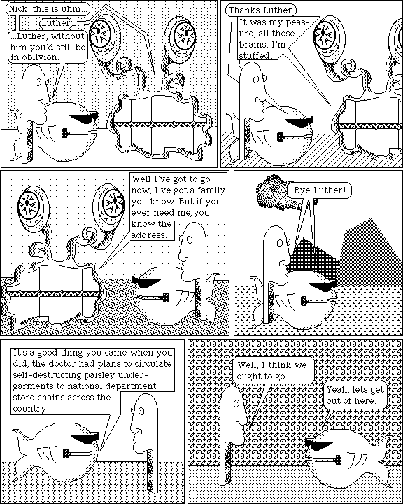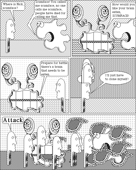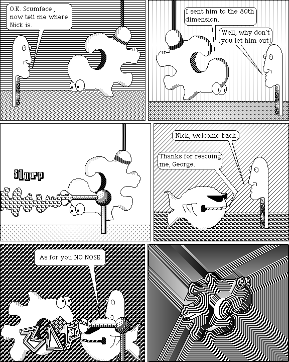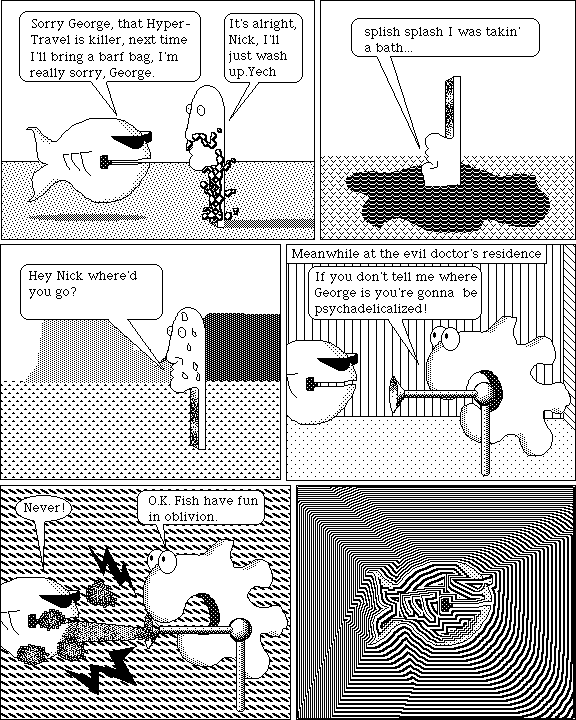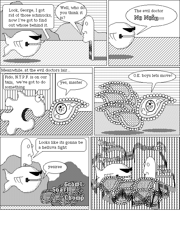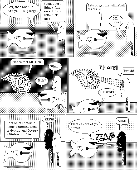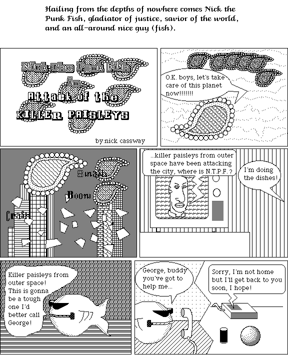 The comic was Nick the Punk Fish, a named coined by a camp counselor who somehow thought it would be funny if the comic was named after me (Nick the Punk Fish was also known by his acronym NTPF. ) In my adolescent joy, I thought my NTPF comics were pretty hysterical (or so stupid, that they were worth laughing about) and I would work industriously on trying to complete entire stories (I think there are two total) This was no easy feat as this was rudimentary computer graphics which meant having to be pretty crafty. (A full story is posted below for all you NTPF enthusiasts out there)